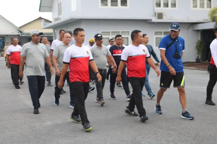 Olahraga bersama diawali dengan jalan santai di jogging track sport center, senam peregangan dan dilanjutkan dengan olahraga permainan beberapa cabang olahraga yang disiapkan seperti tenis meja, bulutangkis, futsal dan panahan.