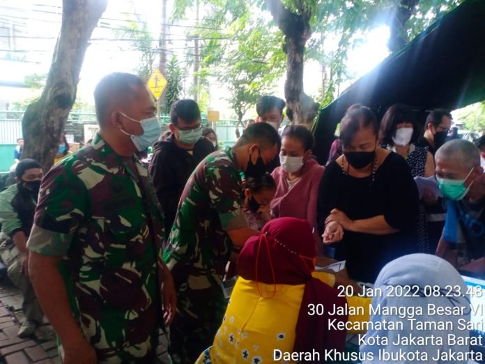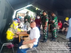 ACTUALNEWS.ID, Jakarta Barat – Serbuan vaksinasi TNI AD di halaman stadion sepak bola Tamansari, Jalan Mangga Besar VI Utara, Rt. 008/001, Kel. Tamansari, Kec. Tamansari hari ini Kamis, 20 Januari 2022 vaksin warga masyarakat sebanyak 263 orang.