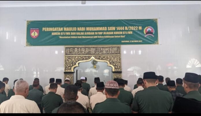 ACTUALNEWS.ID, Banyumas – Danrem 071/Wijayakusuma Kolonel Inf Yudha Airlangga, S.E., menghimbau segenap prajurit dan PNS Korem 071/Wijayakusuma meneladani akhlak mulia Nabi Muhammad SAW. Hal tersebut, diutarakannya saat Keluarga Besar Makorem 071/Wijayakusuma memperingati Maulid Nabi Muhammad SAW, Rabu (12/10/2022) yang berlangsung di Masjid Wijayakusuma, Makorem 071/Wijayakusuma, Sokaraja, Banyumas.