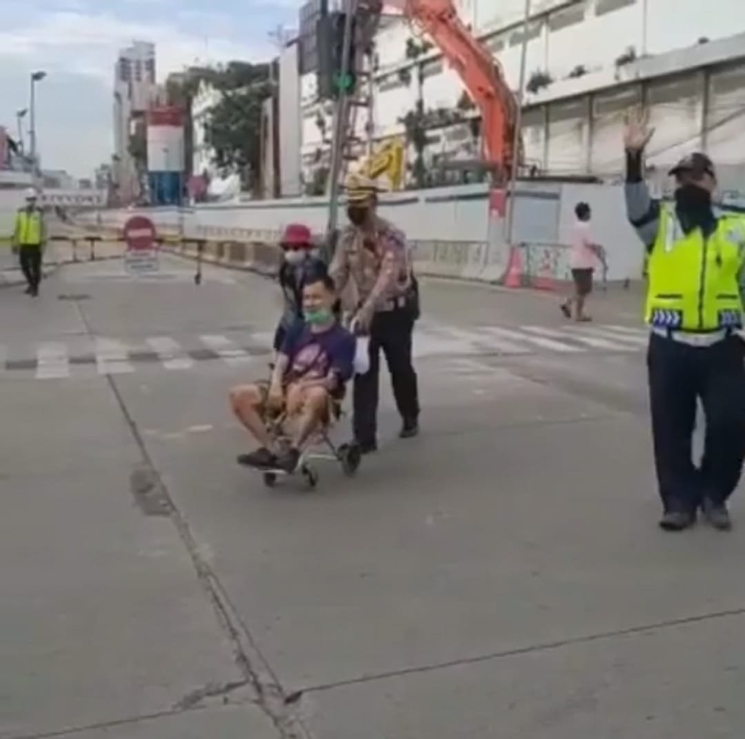 Menyadari seseorang tersebut adalah seorang disabilitas kemudian kanit lantas taman sari kompol Turyono dengan sigap memberikan pertolongan