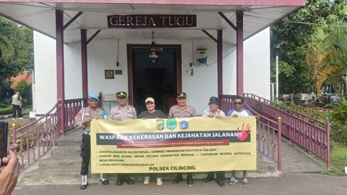 ACTUALNEWS.ID Jakarta, Polsek Cilincing Melakukan Giat Penyerahan dan pemasangan spanduk 3 pilar guna mengagas layanan polisi 110 waspada kekerasan dan kejahatan jalanan, Penyerahan spanduk ini di lakukan di gereja GPIB Tugu Semper Barat Cilincing Jakarta Utara, (24/6/25).