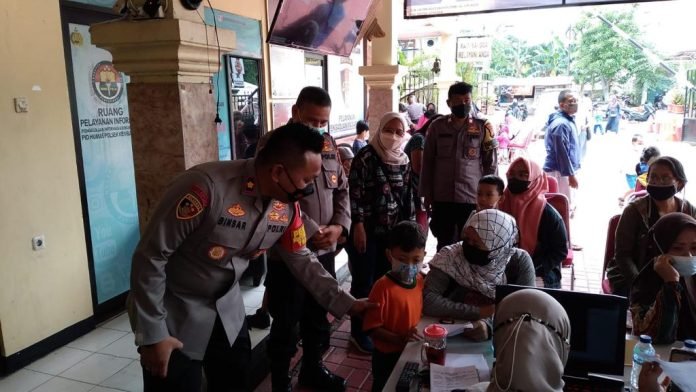 Selain melaksanakan vaksinasi anak, polsek kembangan juga memberikan bingkisan makanan ringan kepada anak usai melaksanakan vaksinasi