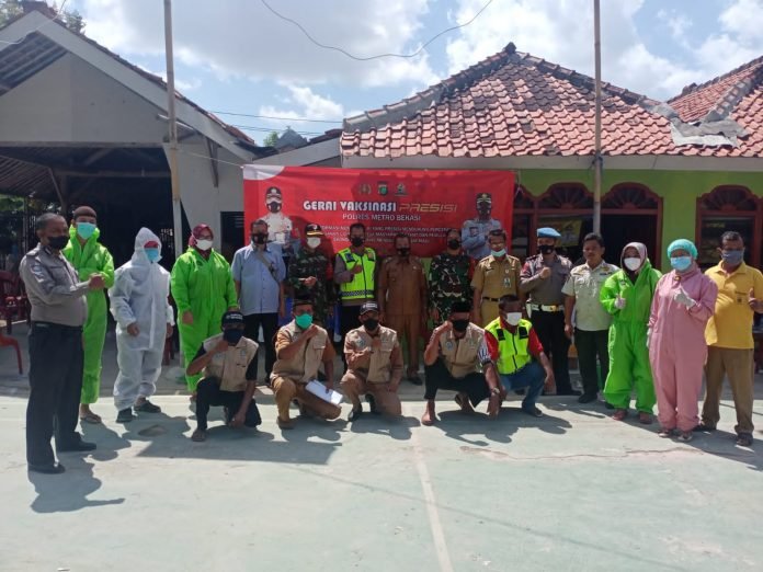 ACTUALNEWS.ID, Bekasi – Polsek Tambelang, Polres Metro Bekasi kerja sama dengan Team Relawan Nakes K Vaksinasi Tambelang gelar operasi kemanusiaan dalam rangka Bhakti Kesehatan Bhayangkara untuk Negeri berupa kegiatan Vaksinasi tahap pertama dangan sasaran masyarakat berusia 12 tahun ke atas dan warga Kediaman Kepala Desa Sukamaju Sarih Kp.Wates Rt.001/03 di Desa Sukamaju, Kecamatan Tambelang, Kabupaten Bekasi, Senin (12/7/2021).
