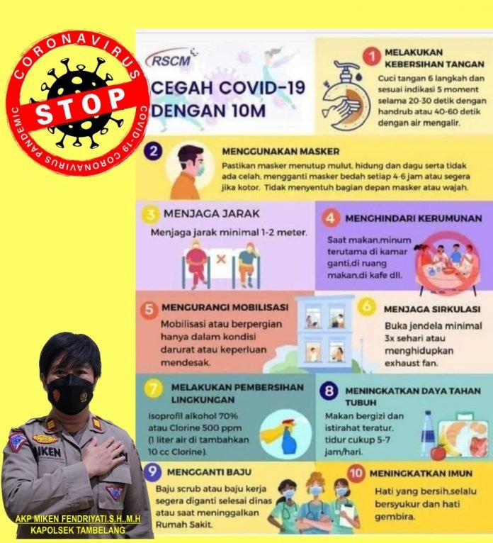 “Bapak Kapolres Metro Bekasi KBP. Hendra Gunawan, S.I.K, MSi sudah mengintruksikan penerapan Prokes baru yang terdiri dari 10M di seluruh wilayah hukum Polresta Bekasi termasuk Polsek Tambelang,” jelas Kapolsek Tambelang, AKP. Miken Fendriyati, Kamis (1/7/2021).