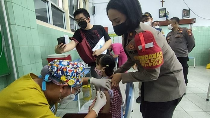 Kapolsek Tanjung Duren Polres Metro Jakarta Barat Kompol Rosana Albertina Labobar mengatakan Hari ini pihaknya bersama para relawan nakes melaksanakan kegiatan vaksinasi anak di SD Bunda Hati Kudus
