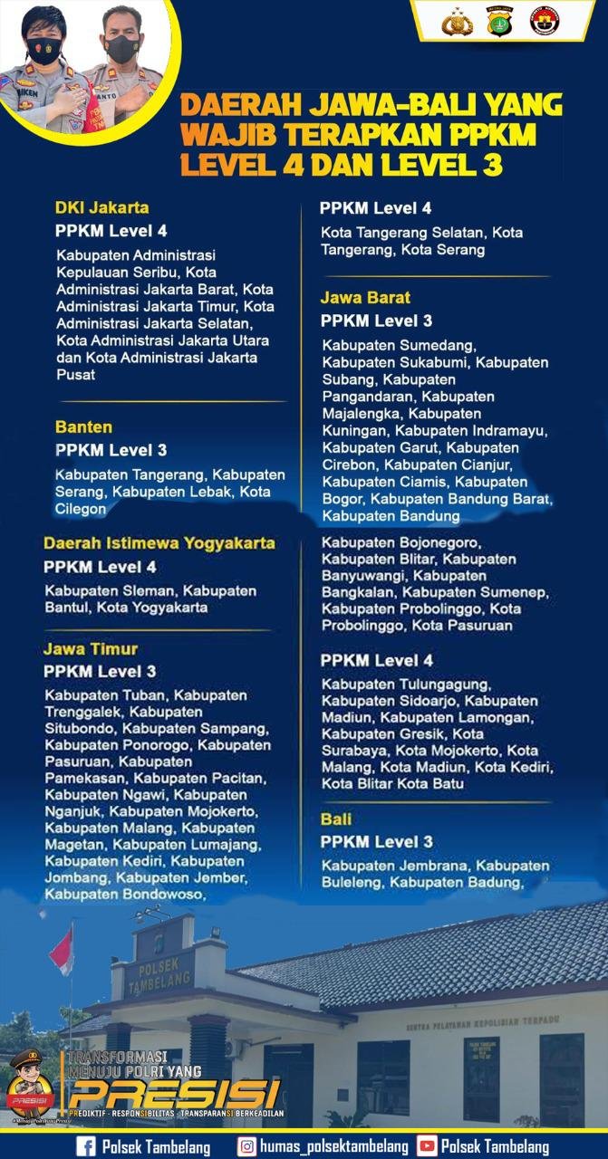 Instruksi itu juga mencantumkan ketentuan PPKM Level 3. Ada 31 kabupaten/kota di Jawa dan Bali yang menerapkan PPKM Level 3. Kemudian, ada satu daerah yang menerapkan PPKM Level 2. Daerah itu adalah Kabupaten Tasikmalaya di Jawa Barat.