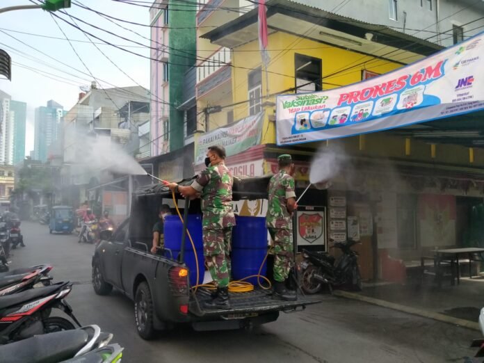 Batuud Koramil 01/TS, Peltu Anton S menjelaskan, sesuai atensi Danramil, Mayor Inf Zulkarnaen Galib, maka kami bersama beberapa personil dan anggota wanra melaksanakan penyemprotan Disinfektan di lingkungan Kelurahan Krukut, Kel. Keagungan, Kel. Glodok, Kel Pinangsia Kec. Tamansari, Jakarta Barat.