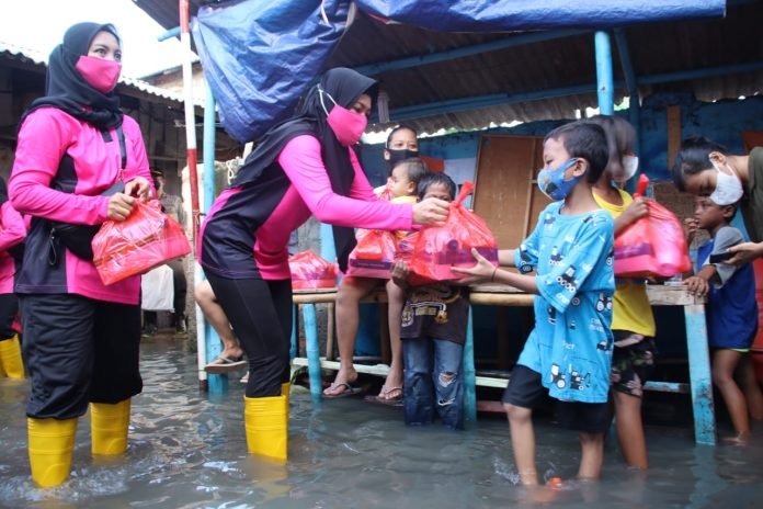 ACTUALNEWS.ID, Jakarta – Bhayangkari cabang Polres Pelabuhan Tanjung Priok dipimpin ketua cabang Ny. Putu Kholis Aryana didampingi Ketua ranting Bhayangkari Polsek Sunda Kelapa Ny.Seto Handoko bersama rombongan ibu ibu Bhayangkari memberikan bantuan kepada warga Muara Angke yang terdampak banjir rob.