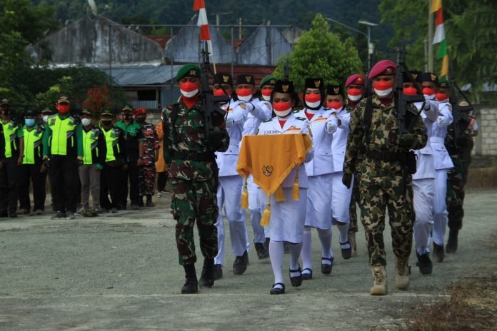 “Upacara Bendera peringatan HUT Republik Indonesia ke – 76 Tahun 2021 di perbatasan RI-PNG berlangsung berbeda dari tahun-tahun sebelumnya dikarenakan pandemi Covid-19 yang saat ini masih melanda Indonesia, meski demikian pelaksanaan upacara bendera tetap berlangsung dengan hikmat dan tetap dengan menerapkan protokol kesehatan”, ujar Wadan Satgas.