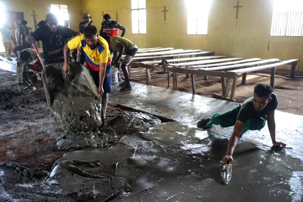 ACTUALNEWS.ID, Papua – Personel Satgas TMMD Ke-112 Kodim 1707/Merauke dipimpin oleh Sersan Mayor (Serma) Kadariono dan puluhan anggota melaksanakan plesteran lantai Gereja Santo Kristus Okor Kampung Okor, Distrik Haju, Kabupaten Mappi-Papua. Senin (11/10/2021).