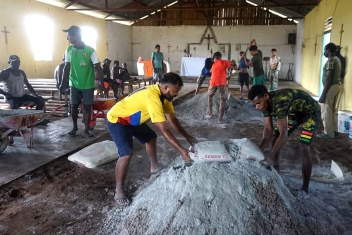 ACTUALNEWS.ID, Papua – Personel Satgas TMMD Ke-112 Kodim 1707/Merauke dipimpin oleh Sersan Mayor (Serma) Kadariono dan puluhan anggota melaksanakan plesteran lantai Gereja Santo Kristus Okor Kampung Okor, Distrik Haju, Kabupaten Mappi-Papua. Senin (11/10/2021).