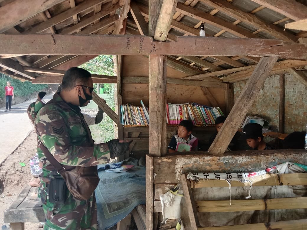 ACTUALNEWS.ID Cianjur -Satgas Tentara Manunggal Membangun Desa ( TMMD ) reguler Ke – 111 menyempatkan diri mendatangi Sejumlah anak anak yang tengah asik membaca Buku di pos baca tepatnya di Kampung Sukasirna Baduga RT 03/06 Desa Ciandam, Kecamatan Mande, Kabupaten Cianjur, Jawa Barat, Jum’at ( 09/07/21).