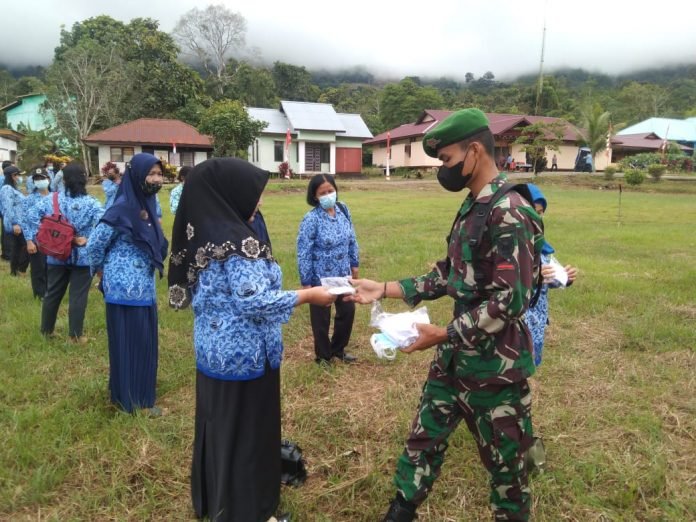 Sebelum pelaksanaan upacara, personel Satgas Pamtas RI-Malaysia Yonif 144/JY membagikan masker bagi warga Desa Lanjak Kecamatan Batang Lupar Kabupaten Kapuas Hulu, Kalimantan Barat
