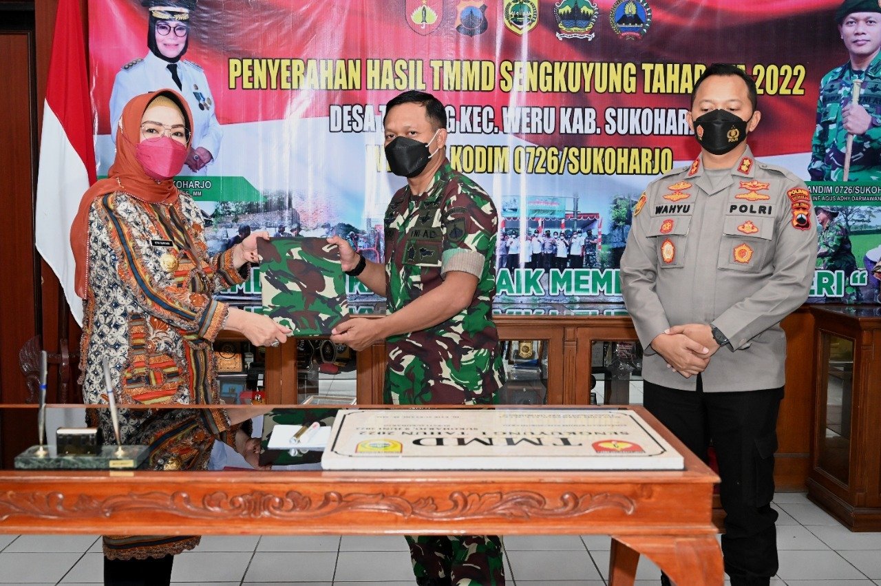 ACTUALNEWS.ID, Sukoharjo (09/06/22) Bertempat di Ruang Loby Kantor Bupati Sukoharjo Jl. Jendral Sudirman No.199 Ds. Gabusan Kel. Jombor Kec. Bendosari Kab. Sukoharjo dilaksanakan acara Penutupan TMMD Sengkuyung Tahap I Tahun 2022 oleh Hj. Etik Suryani SE.MM (Bupati Sukoharjo) dan Penyerahan Hasil Proyek program TMMD Sengkuyung Kodim 0726/Sukoharjo Tahap II Tahun 2021 di Desa Tawang, Kec. Weru Kabupaten Sukoharjo dari Dansatgas TMMD (Dandim 0726/Sukoharjo) kepada Bupati Sukoharjo, Kamis (09/06/22).