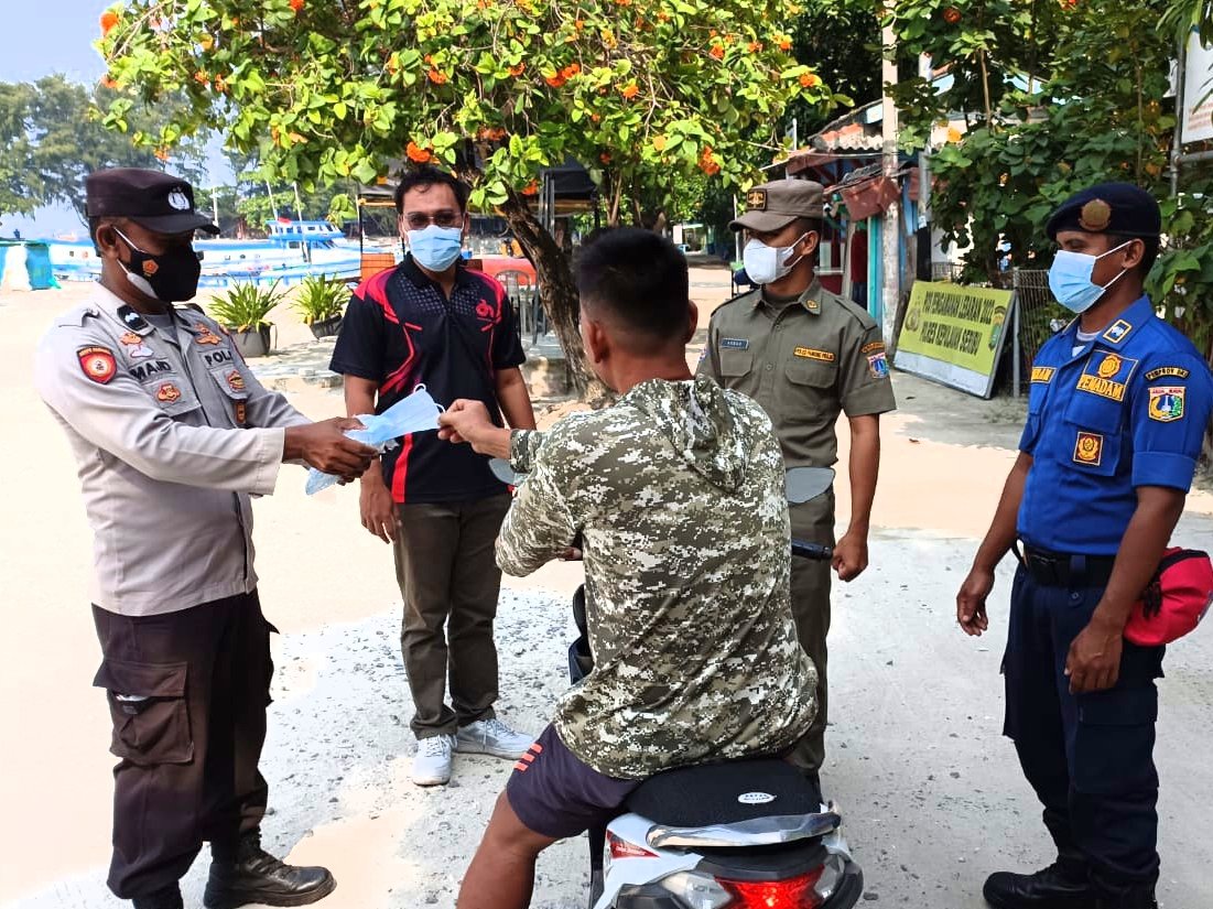 Masker dibagikan secara door to door kepada warga yang sedang berada di Dermaga Keberangkatan menuju Pulau Seribu oleh Polres sedangkan Polsek jajaran membagikan di pulau pulau permukiman diwilayahnya.