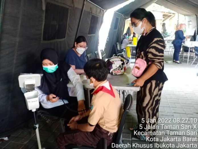 ACTUALNEWS.ID, Jakarta Barat – Koramil 01/Tamansari Kodim 0503/Jakarta Barat terus melayani Vaksinasi untuk pelajar dari usia 6 tahun sampai 11 tahun untuk membentuk Heard Immunity dalam mencegah penyebaran virus Covid -19 yang di gelar di halaman stadion sepak bola Tamansari, Jalan Mangga Besar VI Utara, Kel.Tamansari, Kec. Tamansari Kota Adm Jakarta Barat. Rabu, (05/01/2022)