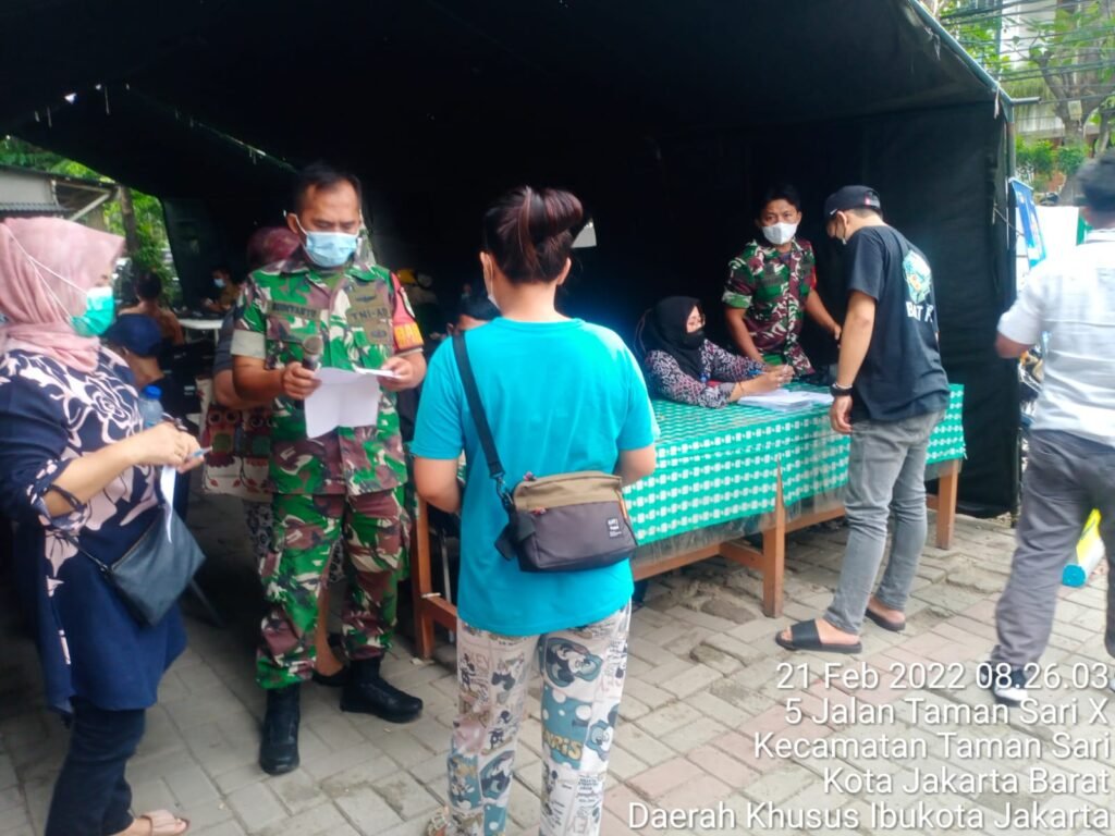 ACTUALNEWS.ID, Jakarta Barat – Kodim 0503/JB, Koramil 01/TS – Serbuan vaksinasi Kodim 0503/JB yang di laksanakan Koramil 01/Tamansari yang bekerjasama dengan puskesmas Tamansari di halaman stadion sepak bola Tamansari, Jalan Mangga Besar VI Utara, Kel. Tamansari, Kec. Tamansari, Jakarta Barat – Vaksin 194 orang. (Senin, 21/2/22)