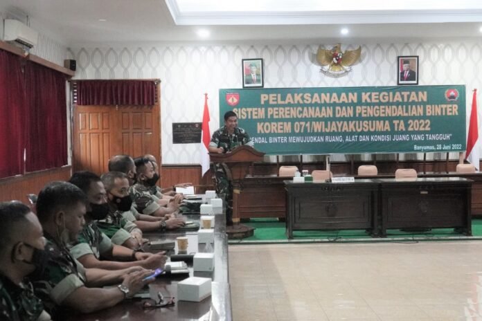 ACTUALNEWS.ID, Banyumas – Guna untuk mensinergikan program Pembinaan Teritorial Korem 071/Wijayakusuma dengan Program Pemerintah Daerah, Korem 071/Wijayakusuma menggelar Sistim Perencanaan dan Pengendalian (Sisrendal) Pembinaan Teritorial (Binter) dengan jajarannya. Selasa (28/6/2022) di Aula Jenderal Sudirman Makorem 071/Wijayakusuma, Sokaraja, Banyumas.