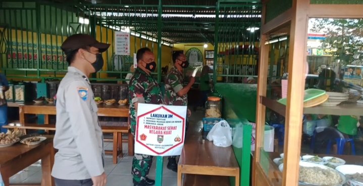 “Penegakan disiplin protokol kesehatan kali ini dilaksanakan oleh aparat gabungan, menyasar ke warung makan dan pertokoan. Hal ini bertujuan untuk mengecek pelaksanaan prokes dimasa pandemi saat ini. Dalam kegiatannya tiga pilar melakukan himbauan dan pengecekan ketersediaan sarana cuci tangan dan berbagai aktivitas operasional yang sesuai dengan protokol kesehatan”, tutur Sertu Mulyono