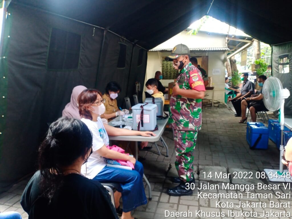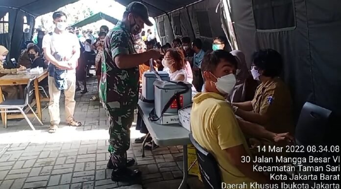 ACTUALNEWS.ID, Jakarta – Kodam Jaya, Kodim 0503/Jakarta Barat – Dengan 6 personil Tenaga Kesehatan dari Puskesmas Tamansari dan 2 personil team Picare dengan target 100 orang, serbuan vaksinasi Kodim 0503/JB yang di laksanakan Koramil 01/Tamansari berhasil vaksin sebanyak 264 orang warga masyarakat. Senin (14/3).