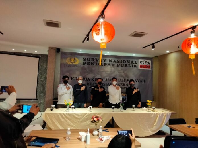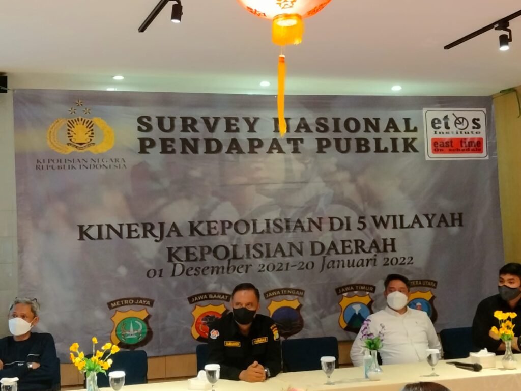 ACTUALNEWS.ID, Jakarta (11/02) – Direktur ETOS Institute, Iskandarsyah katakan, ada peningkatan penilaian masyarakat terhadap kinerja Polisi Republik Indonesia (Polri). Adapun, Survey Nasional Jajak Pendapat Publik, Kinerja Kepolisian di 5 Wilayah Kepolisian Daerah 01 Desember sampai dengan 20 Januari 2022. Demikian kata Iskandar, saat berikan keterangan terkait rilis survey ETOS yang digelar di bilangan Salemba Jakarta Pusat. Jakarta, Jumat (11/02)