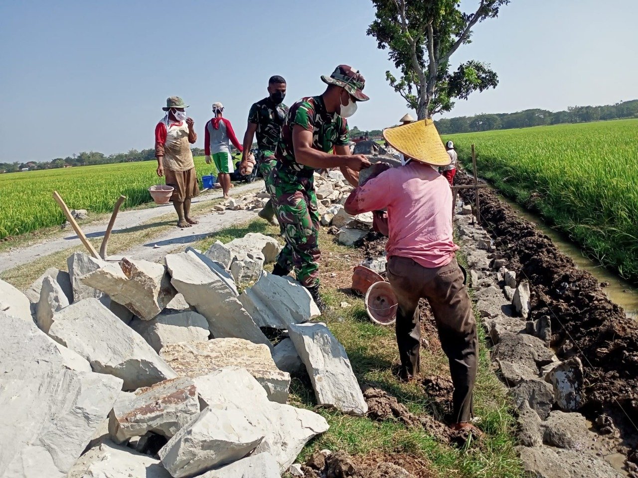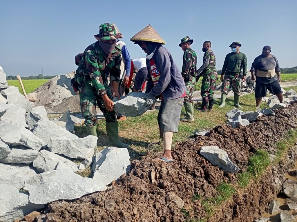Tak peduli cuaca terik dari matahari dan minimnya pohon peneduh di tengah sawah tak membuat anggota Satgas TMMD dan warga menyerah begitu saja untuk merampungkan pekerjaan pembuatan talud tersebut, Sabtu (09/10).
