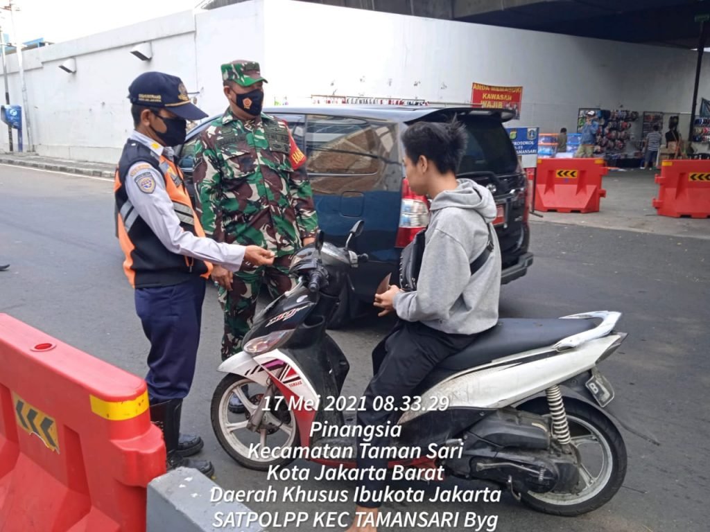 ACTUALNEWS.ID, Jakarta -Tekan penyebaran virus Covid-19 di Wilayah Koramil 01/TS Kodim 0503/JB ,Babinsa Koramil 01/TS Serda Jumadi bersama Satpol PP, Dishub dan Lantas gelar Operasi yustisi disiplin protokol kesehatan diawali dengan Apel kesiapan dipimpin Kasatpol PP Tamansari Asmar Panjaitan.