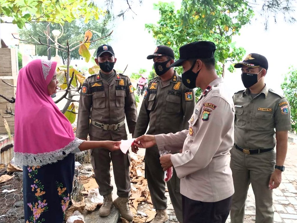 Masker dibagikan secara door to door kepada warga yang sedang berada di Dermaga Keberangkatan menuju Pulau Seribu oleh Polres sedangkan Polsek jajaran membagikan di pulau pulau permukiman diwilayahnya.