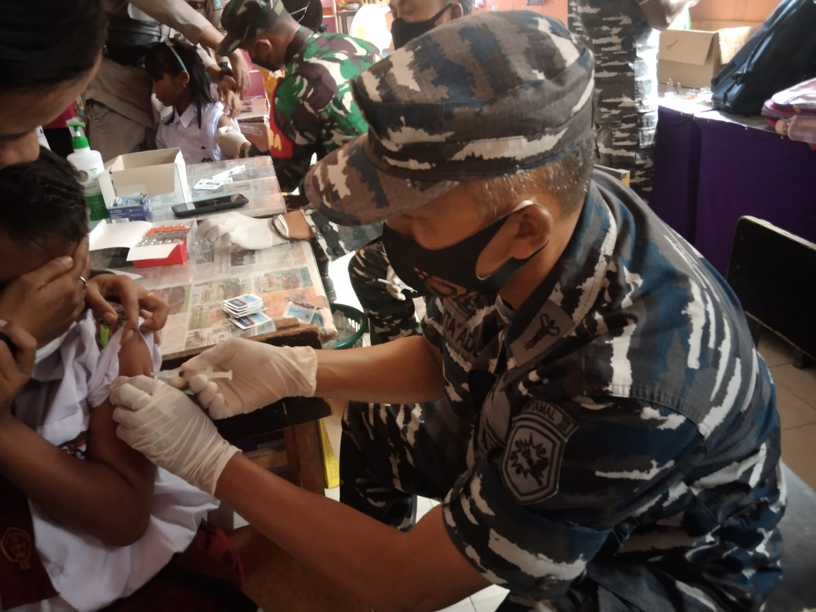 Untuk mempermudah pelaksanaan vaksinasi, Tim kesehatan Lanal Babel kembali bekerjasama dengan pihak Sekolah Dasar yang berada di lingkungan Mako Lanal Babel yakni SDN 19 dan SDN 20 Belinyu.
