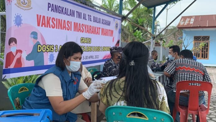 ACTUALNEWS.ID, Tanjung Balai – Warga disekitar Gereja HKI Sirantau Jalan Jamin Ginting/Alteri, Sirantau, Kecamatan Datuk Bandar, Kota Tanjungbalai mendapatkan layanan vaksinasi Covid-19 oleh tim nakes Lanal Tanjung Balai Asahan, Senin (25/4/2022).