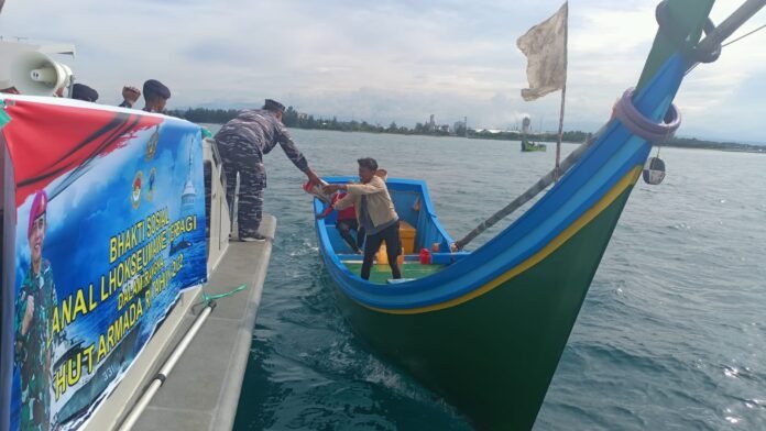 ACTUALNEWS.ID, TNIAL, Lanal Lhokseumawe,- Komandan Lanal Lhokseumawe Kolonel Marinir Dian Suryansyah, S.E., M.Tr.Hanla, M.M., yang diwakili oleh Mayor Laut (KH) Fahrizal sebagai Perwira Staf Potensi Maritim (Paspotmar) beserta jajaran Lanal Lhokseumawe melaksanakan Bhakti Sosial dalam rangka menyambut HUT Armada RI Tahun 2022, bertempat di Perairan Krueng Geukeuh, Kecamatan Dewantara, Kabupaten Aceh Utara, Jumat (02/12/2022).