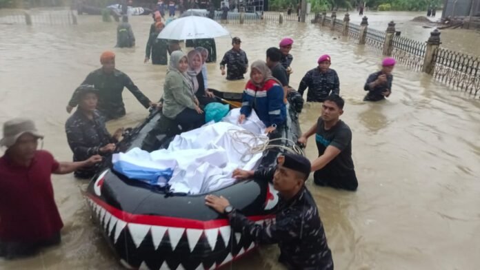 ACTUALNEWS.ID, Aceh Utara,- Pangkalan TNI Angkatan Laut (Lanal) Lhokseumawe bersama Kipan B Yonko 469 Kopasgat melaksanakan penanggulangan banjir yang merendam Kabupaten Aceh Utara meluas ke 12 kecamatan. Banjir menyebabkan Ibukota Aceh Utara terendam serta 18.160 warga mengungsi ke sejumlah titik lebih tinggi.