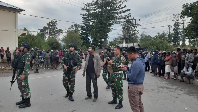 ACTUALNEWS.ID, Wamena – Sebanyak 1 SSK personel TNI dari Kodim 1702/Jayawijaya dan 1 SSK dari Yonif 756/WMS disiagakan untuk membantu Polres Jayawijaya dalam meredam bentrokan antar masyarakat dari dua suku yakni suku Lanny Jaya dan Suku Nduga di Distrik Wouma, Kab. Jayawijaya, Minggu (9/1).