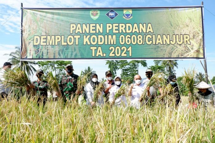 ACTUALNEWS.ID, Cianjur – Guna memenuhi ketersediaan beras dalam rangka ketahanan pangan, Kodim 0608/Cianjur melakukan panen raya demplot di Kampung Pasir Angin, Desa Gasol, Kecamatan Cugenang, Kabupaten Cianjur, Rabu 22 September 2021.
