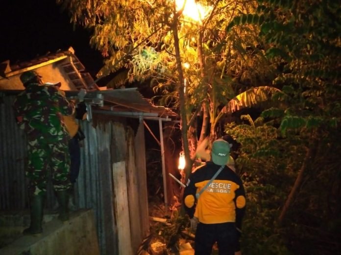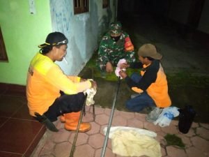 ACTUALNEWS.ID, Sragen – Babinsa Saradan, Sertu Joko Priyanto anggota Koramil 02/Karangmalang, Kodim Sragen bersama Bp. Joko Warsito ( CORE / Rescue ), RELAWAN SARADAN serta Warga Dk. Pantuk melakukan tindakan evakuasi sarang tawon Vespa yang bersarang di Pekarangan Ibu Darsih Dk.Pantuk Rt.14 Rw.03 Desa Saradan Kec. Karangmalang, Kamis Malam (30/12/2021).